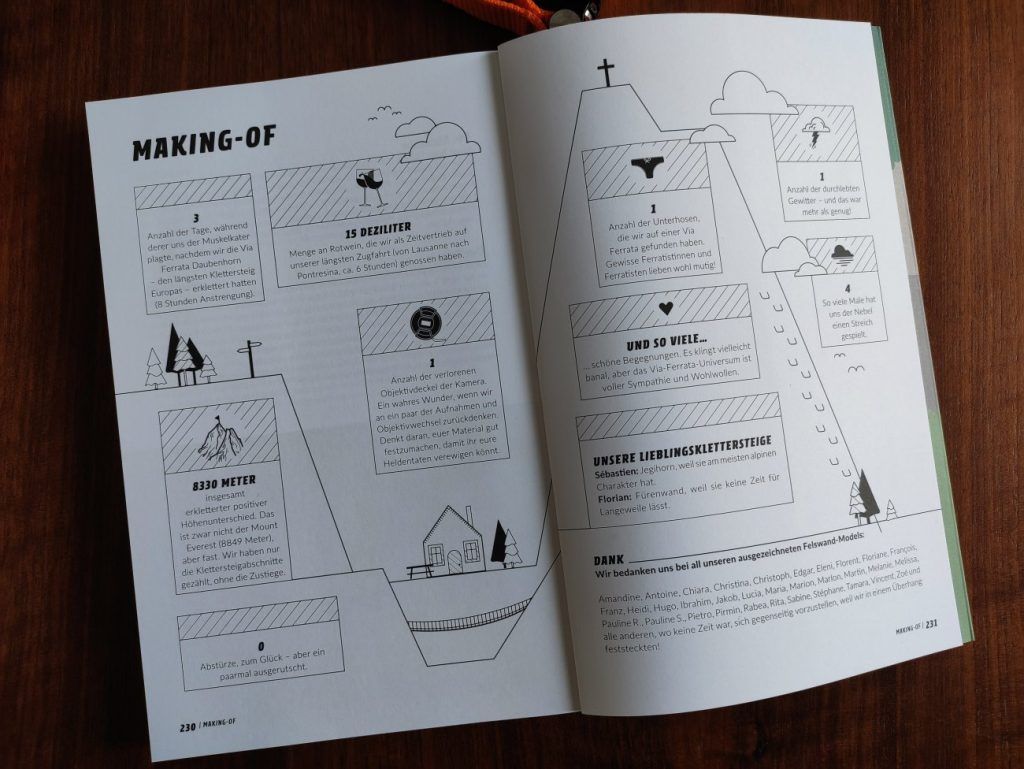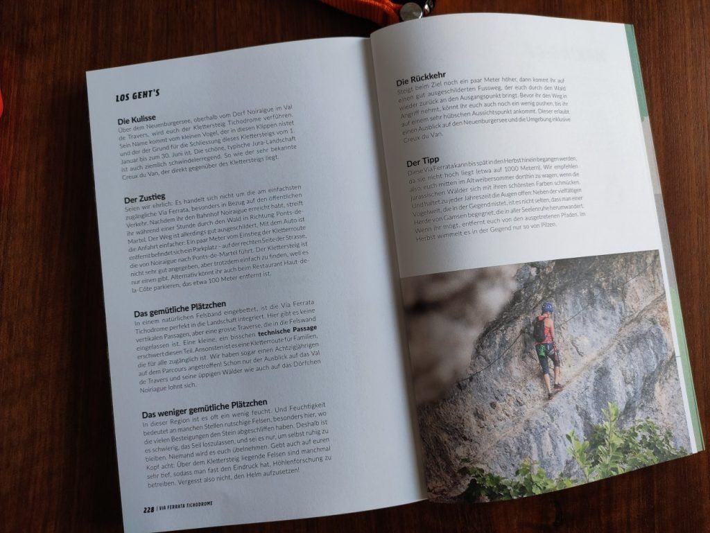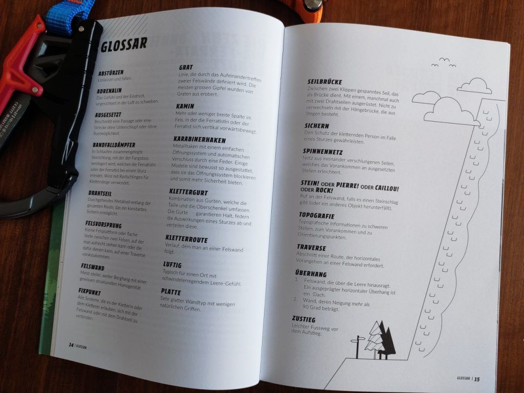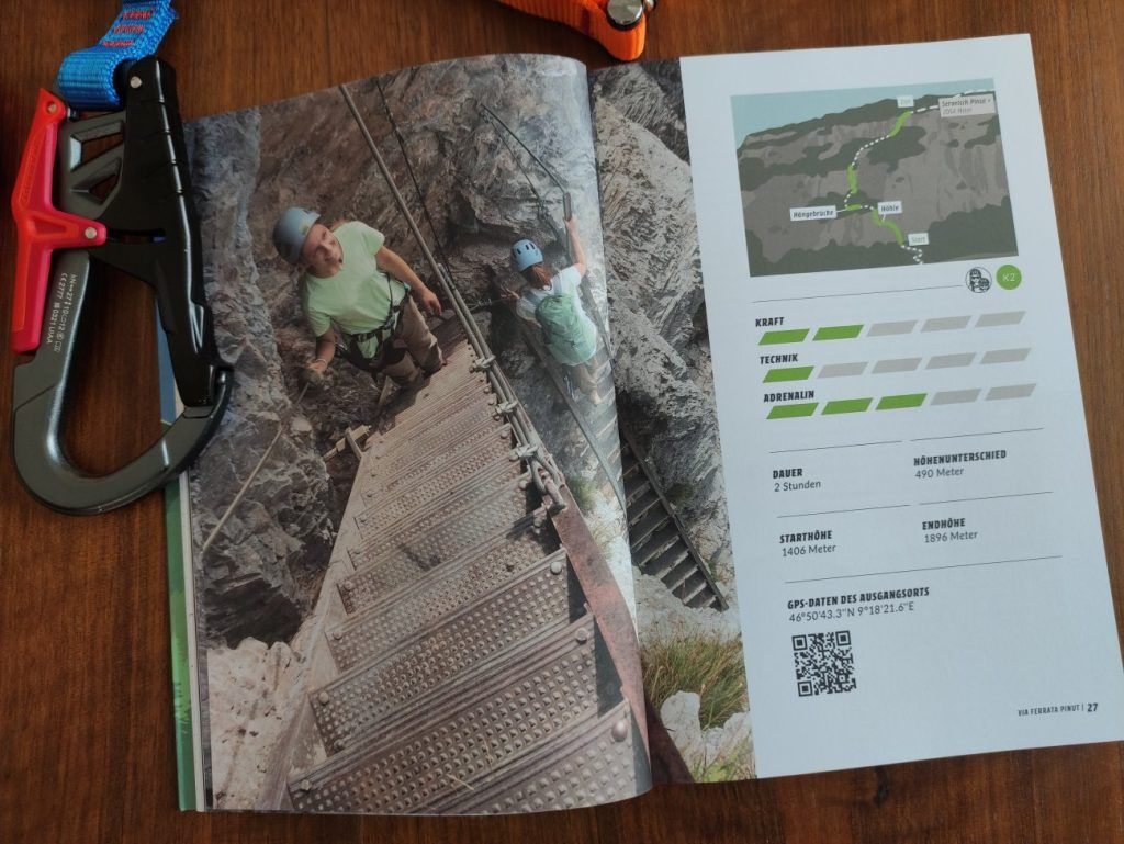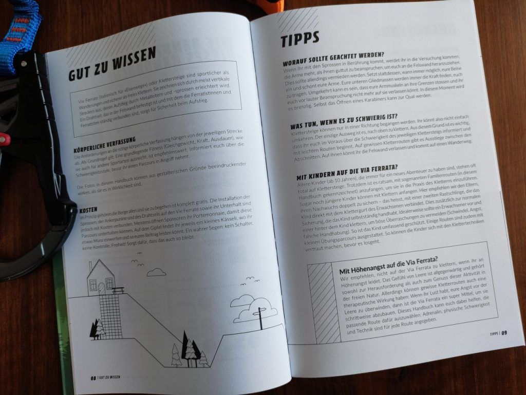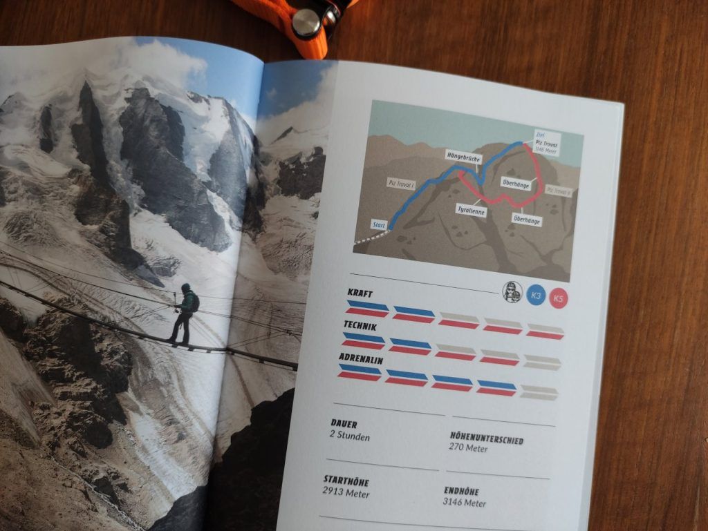 Allerdings muss man sich auf eigene Recherchen vorbereiten, denn die Beschreibungen bleiben insgesamt etwas minimalistisch. Für den Zustieg und den Abstieg, die oft entscheidend sind, fehlen mir beispielsweise detaillierte Angaben. Auch die enthaltenen Topo-Karten sind eher dekorativ als informativ und bieten im Vergleich zu anderen Klettersteigführern nur begrenzte Informationen.