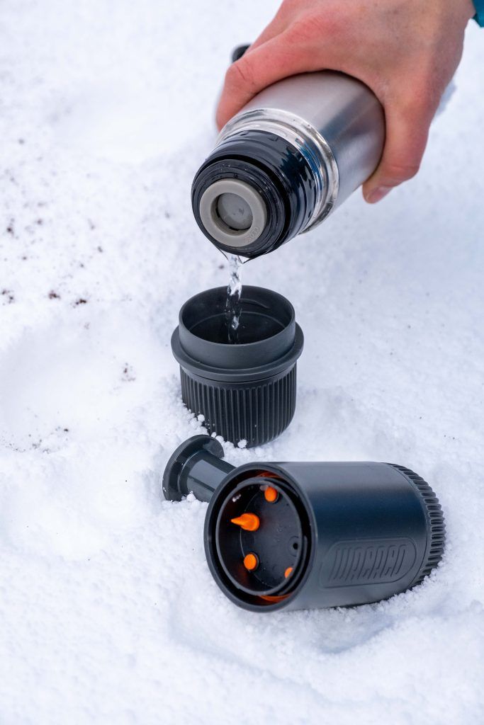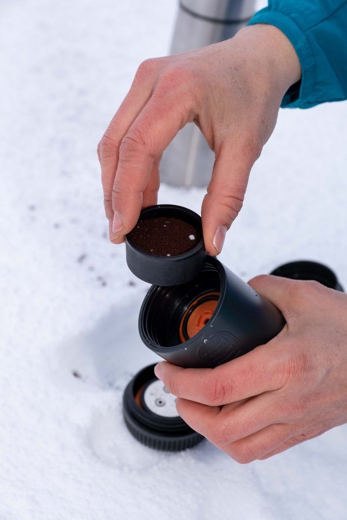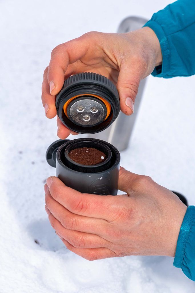 Die Wacaco Nanopresso hat immer super funktioniert. Schwierigkeiten hatte ich mit der Zubereitung aber, wenn es sehr kalt war. Die Teile sind fein und klein und schwer mit Handschuhen zu bedienen – was eiskalte Hände und Kuhnagel zur Folge hatte. Der Kaffee kühlt bei sehr tiefen Temperaturen sehr schnell aus – anstatt sich zu wärmen geniesst man dann eben Eiskaffee. Wenn es stark windet, wird das Kaffeepulver weggeweht, da empfiehlt es sich, die Nanopresso schon zu Hause mit Pulver zu füllen und nur noch das Wasser einzufüllen. Die Nanopresso ist also eher etwas für milde Temperaturen und Wetter, das zum Hinsetzten und Geniessen einlädt.